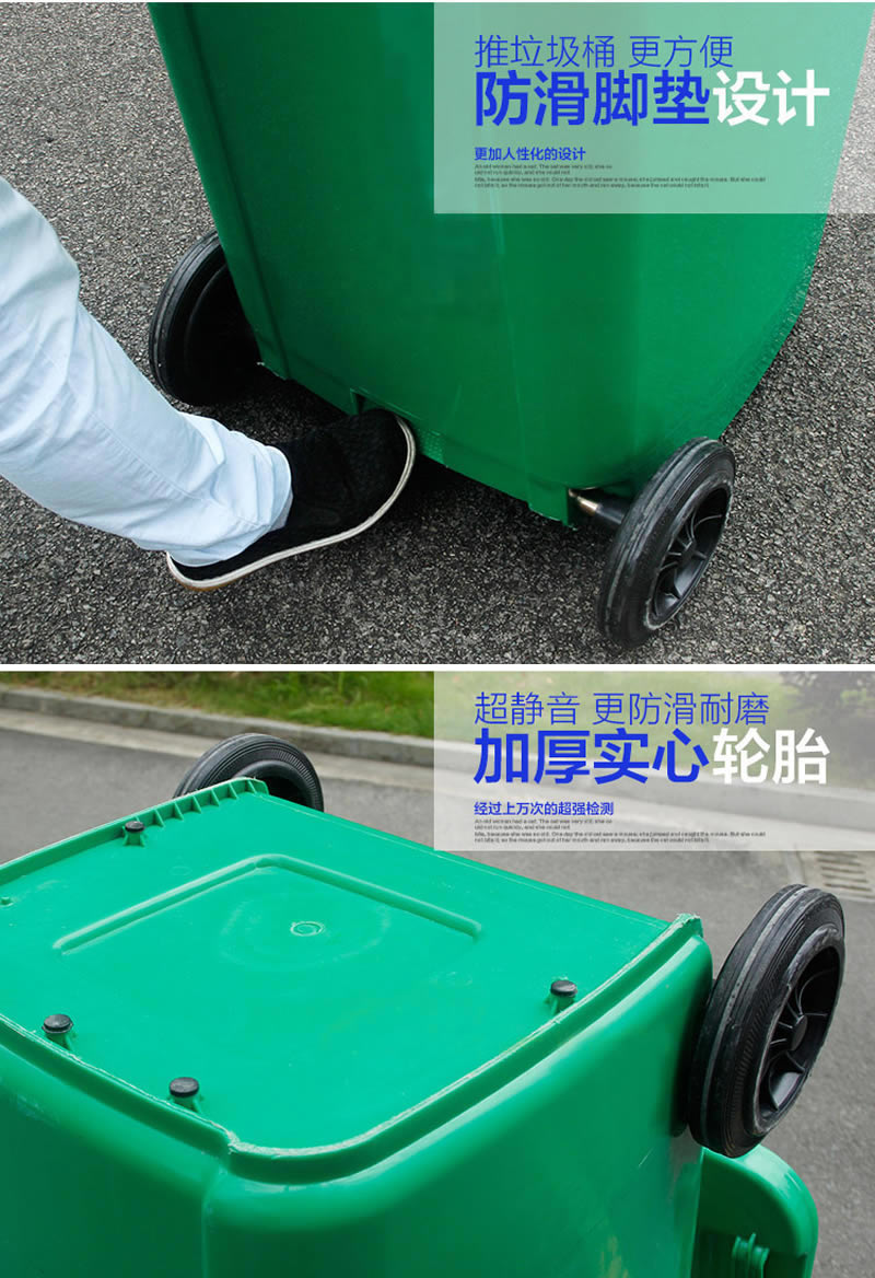 100%全新料HDPE采取先进去的注塑工艺一次性注塑成型,适用环卫、物业小区、学校、医院、广场、商场等场所!